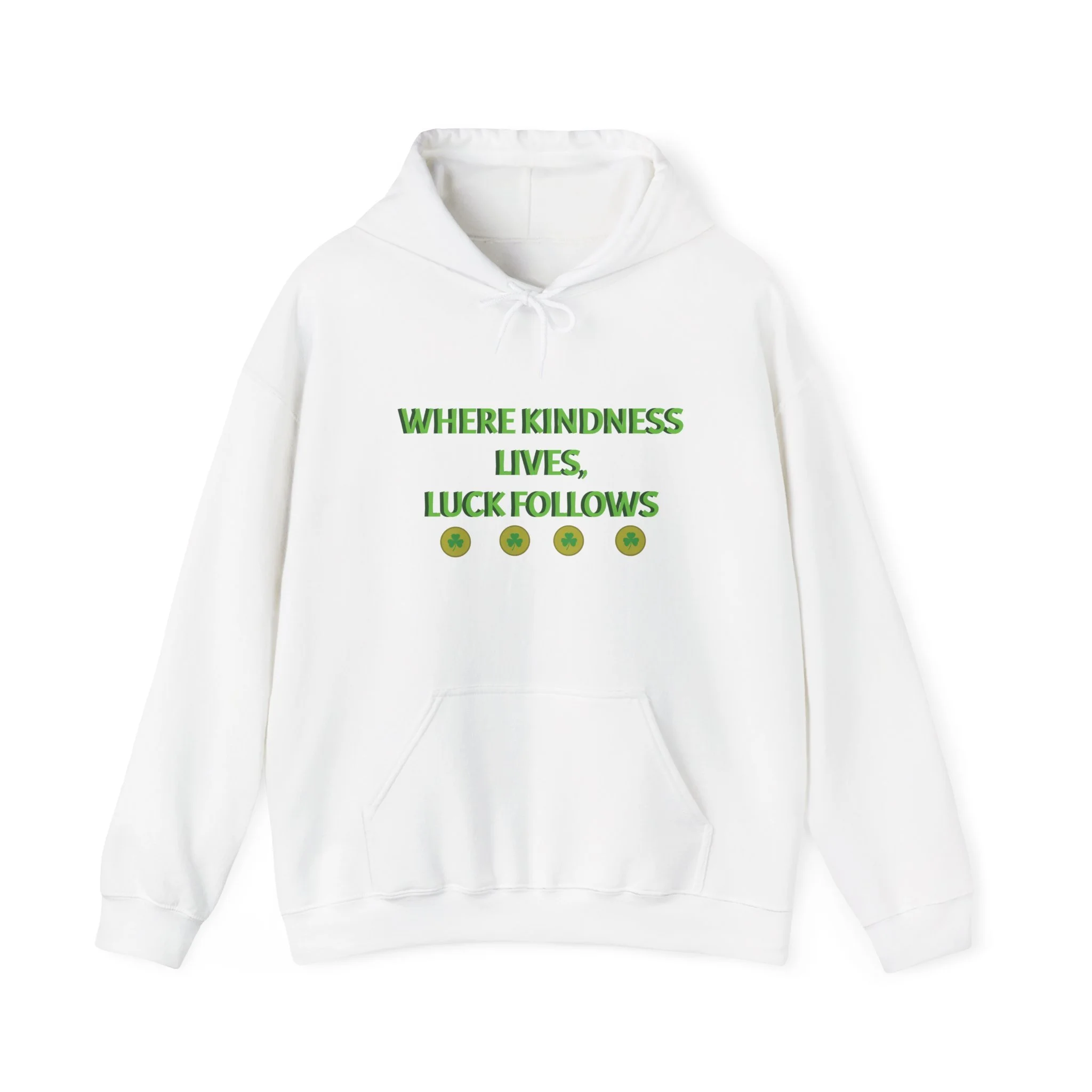 This soft, medium-weight hoodie carries a calm, uplifting message with quiet confidence. The minimal, centered text — “WHERE KINDNESS LIVES, LUCK FOLLOWS” — sits on a clean white canvas, making the statement subtle yet unmistakable. The double-lined hood and color-matched drawcord add durability and a polished look, while the roomy kangaroo pocket keeps hands warm and belongings close. Made from a 50/50 cotton–polyester blend, it offers cozy warmth without bulk and resists shrinking and stretching. Thoughtful construction (no side seams, tear-away label) keeps the silhouette smooth and comfortable for daily wear. This hoodie slips easily into slow mornings, travel days, and quiet evenings — a wearable reminder to move through the world with gentle intent.
